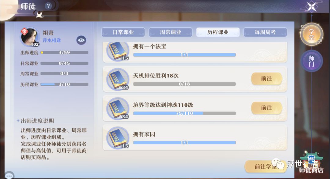 历程课业是出师的必要条件之一,每完成1个历程课业都可获得不同数值的高徒值。