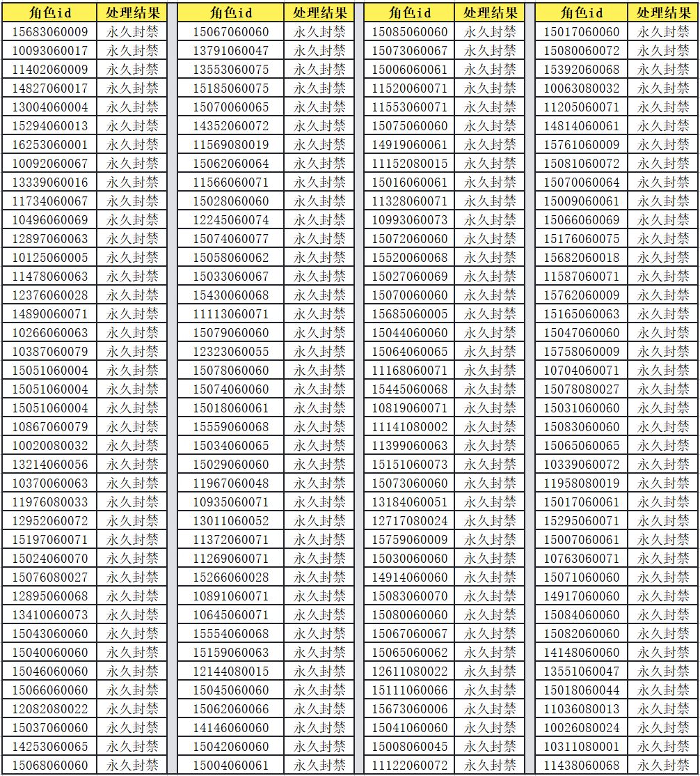 6月12日至6月18日,我们共处罚了8679位使用外挂的玩家,由于名单较长仅截取部分公示,以下为部分封禁名单: