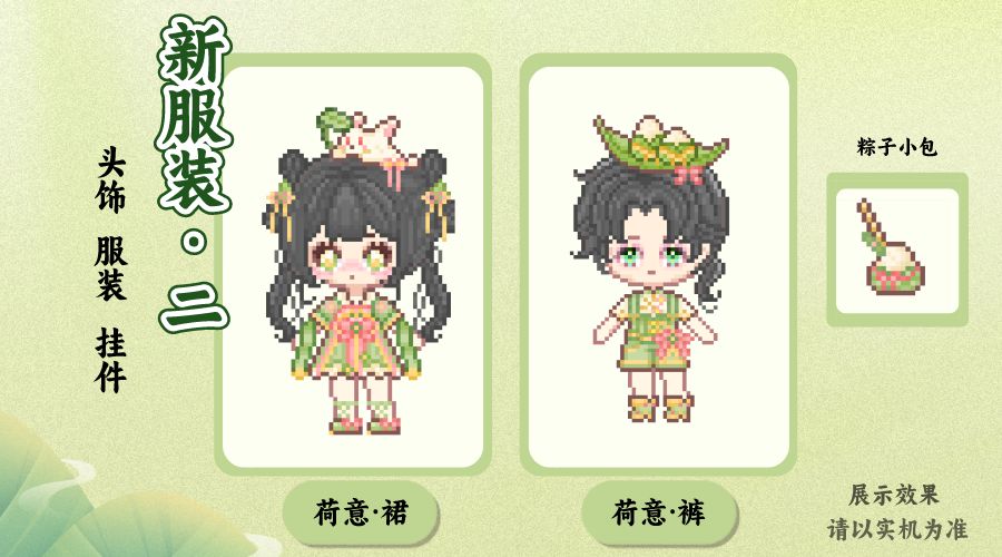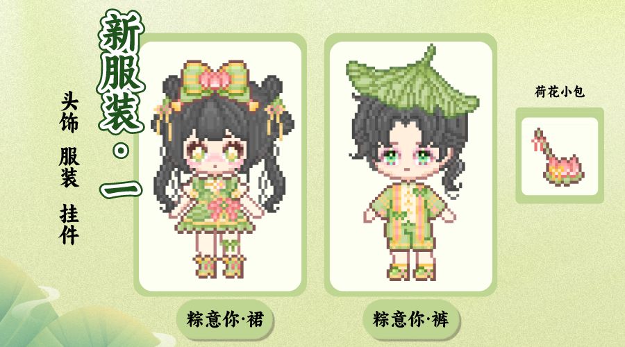 本次更新,以荷花的清雅和粽子的青绿为主题吗,融合LOLITA和汉元素,设计出男女各两套服饰。