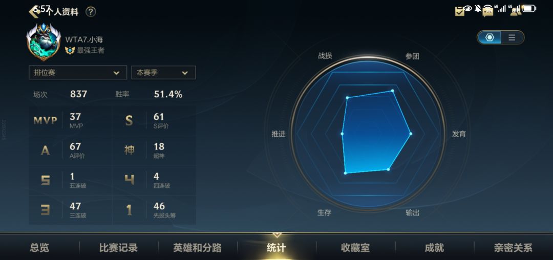 这手游相比端游技术含量真的很低了,端游没有保护卡这种东西,50胜率打几百场黄金都上不了。