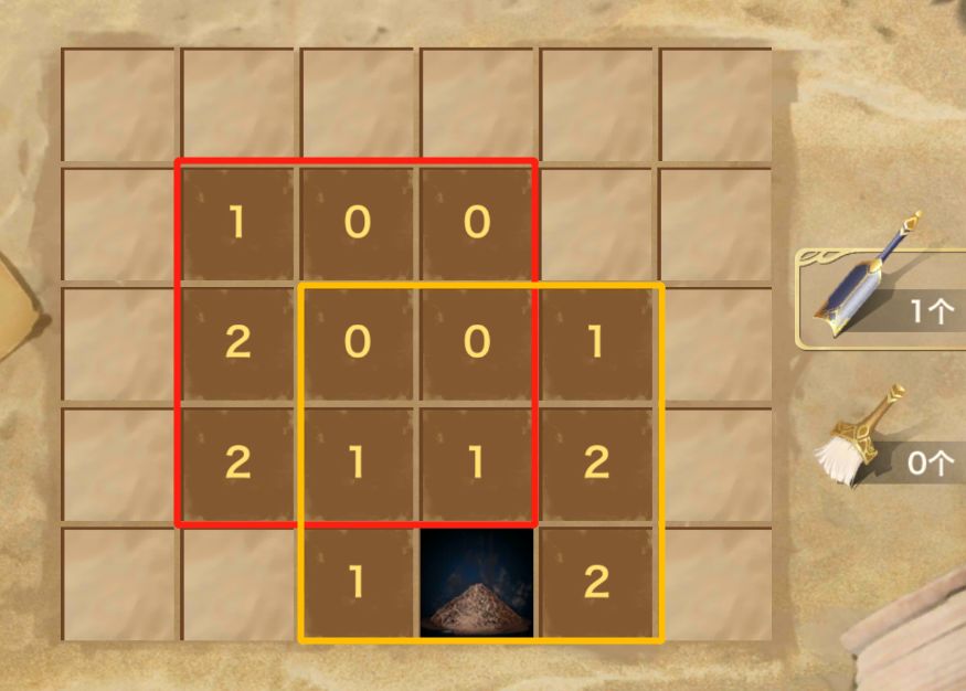 以上方图1为例,红框中的"0",代表以该数字为中心的8个相邻格子中,没有文物碎片。以上方图2为例,黄框中心的“1”,代表以该数字为中心的8个相邻格子中,有1个文物碎片。