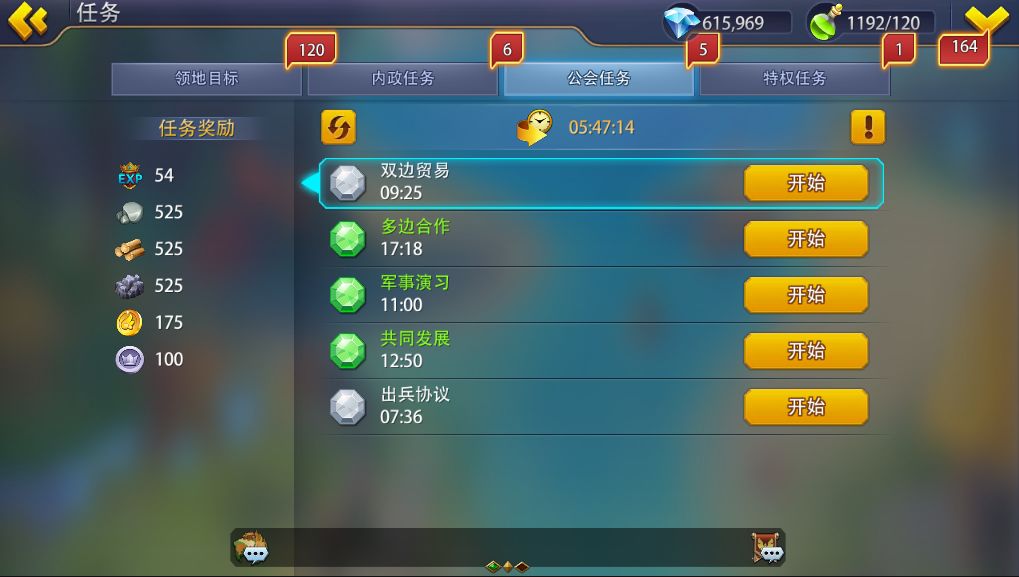 任务分为领地目标、内政目标、公会任务、特权任务四种类型。可通过主界面右侧菜单进入任务界面。任务系统提供玩家当前可完成的短期目标,如升级建筑、训练士兵、通关冒险、采集资源等。完成任务后可获得基本道具如:木材、石头、粮食、铁矿、领主经验、领主实力等。