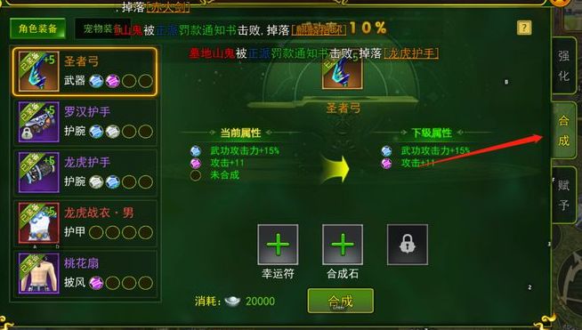 合成需求材料:金刚石/寒玉石——武器/衣服合成石材料幸运符——提升合成成功率同样是在【NPC刀剑笑】处进行装备合成,如下示例图:每件装备可以合成4颗金刚石/寒玉石,合成数量越多,则合成成功率则越低!可以通过幸运符提升一定的合成成功率!合成失败不会对装备造成任何不良后果!进阶锻造目标:元素赋予