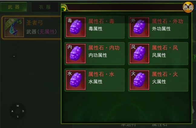 赋予材料:属性石:属性石分为6种元素属性火——武器效果(无视防御);衣服效果(无视对方攻击力)毒——武器效果(增加攻击力);衣服效果(使攻击自己的敌人中毒)风——武器效果(增加命中);衣服效果:(增加回避)水——武器效果(使对方愤怒值消失);衣服效果(获得额外愤怒值)外功——武器效果(普攻追加伤害);衣服效果(防御力增加)内功——武器效果(武功攻击力);衣服效果(武功防御力)幸运符——增加赋予成功率,赋予等级越高则成功率越低(合成失败会清空赋予属性等级,其他无损失)