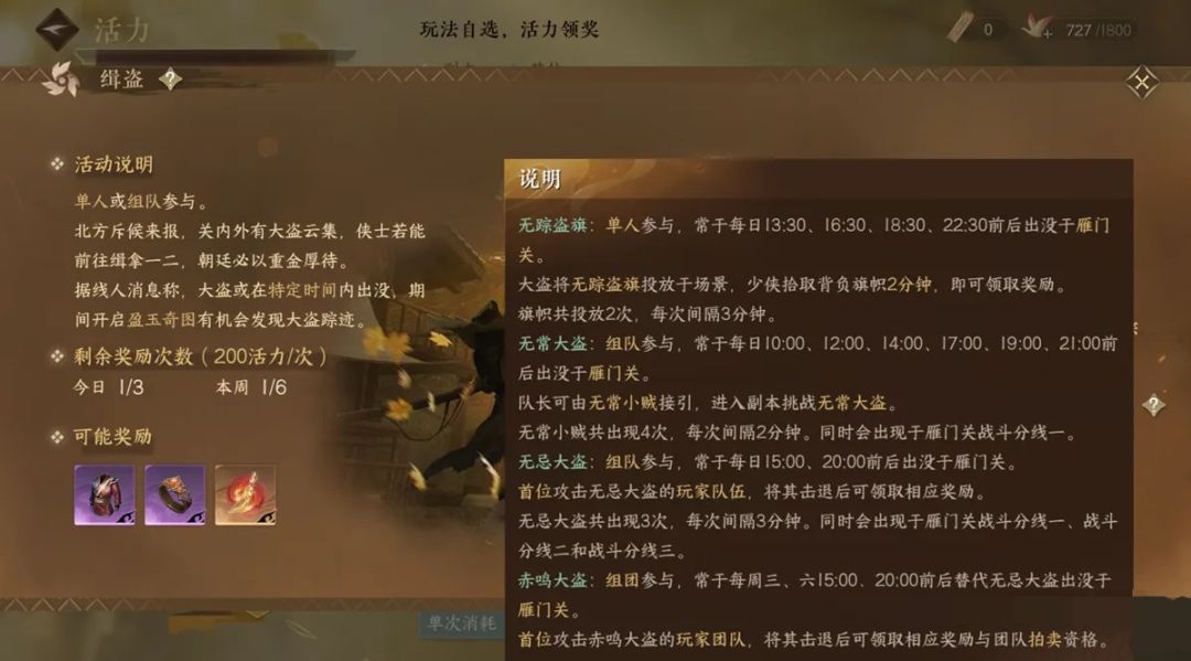 点击右上角青崖书往下翻就可以看到缉盗。每周6次每日最多3次,可以选择简单打