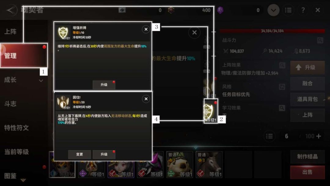 刚刚已经介绍过,在管理页面大家可以查看魂契者的信息、确认魂契者技能,魂契者技能分为“普通技能”与“终极技能”,普通技能可以进行变更、升级,而终极技能是固定技,只能进行升级强化。升级技能需要消耗黄水晶与一定的金币,参与【荣光之战】后可在“荣光之战商店”中兑换黄水晶。