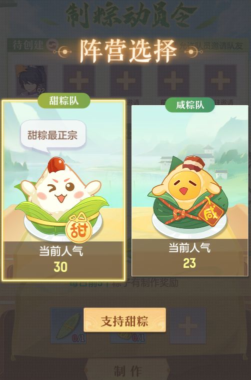 2、咸甜粽子各有所爱,选择喜爱的口味阵营,制作所属阵营粽子越多,动员令等级越高,解锁的奖励越多,更有长安珍品粽、限时组队框、咸甜粽子背饰等好礼献上。