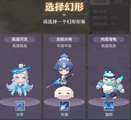 御灵师们幻形成心仪的模样,匹配进行3v3竞技赛。御灵师可幻形的形象为:高速河灵、肉盾海龟和全能水将,每种幻形形象均拥有专属且强大的主动技能。