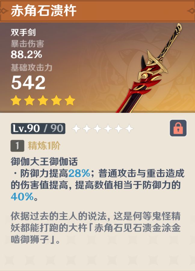 副属性是双暴,还是非常不错的。但因为是一斗专武,所以特效给的是提高防御力,普通攻击和重击伤害提高的数值,也是防御力加成,再加上基础攻击力较低,因此赤角适合吃防御力的角色,除了一斗外,只有主C流女仆和辛焱可以使用。