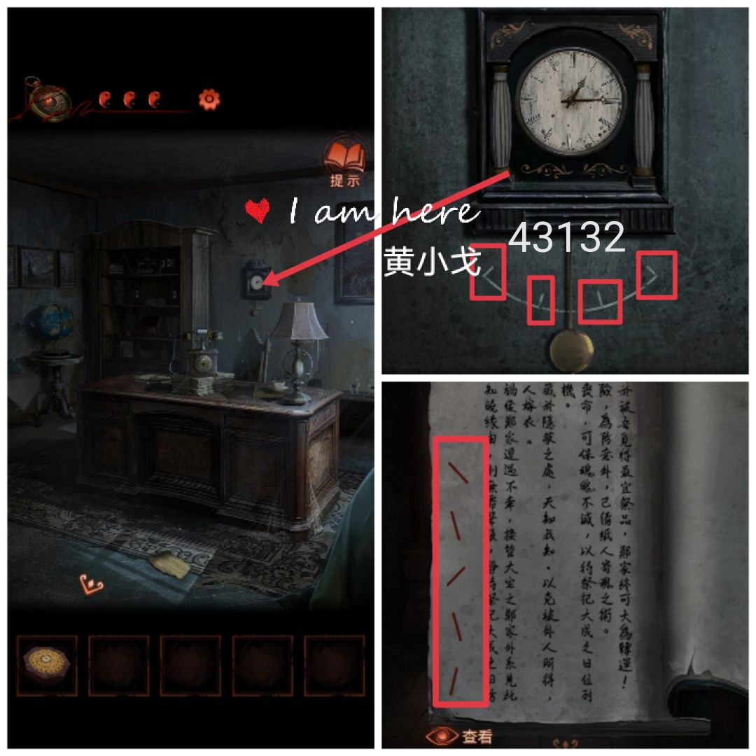 17.(书房)点击墙上的钟,根据暗格里的书本上的信息,按顺序调整时钟摆动的幅度(43132)