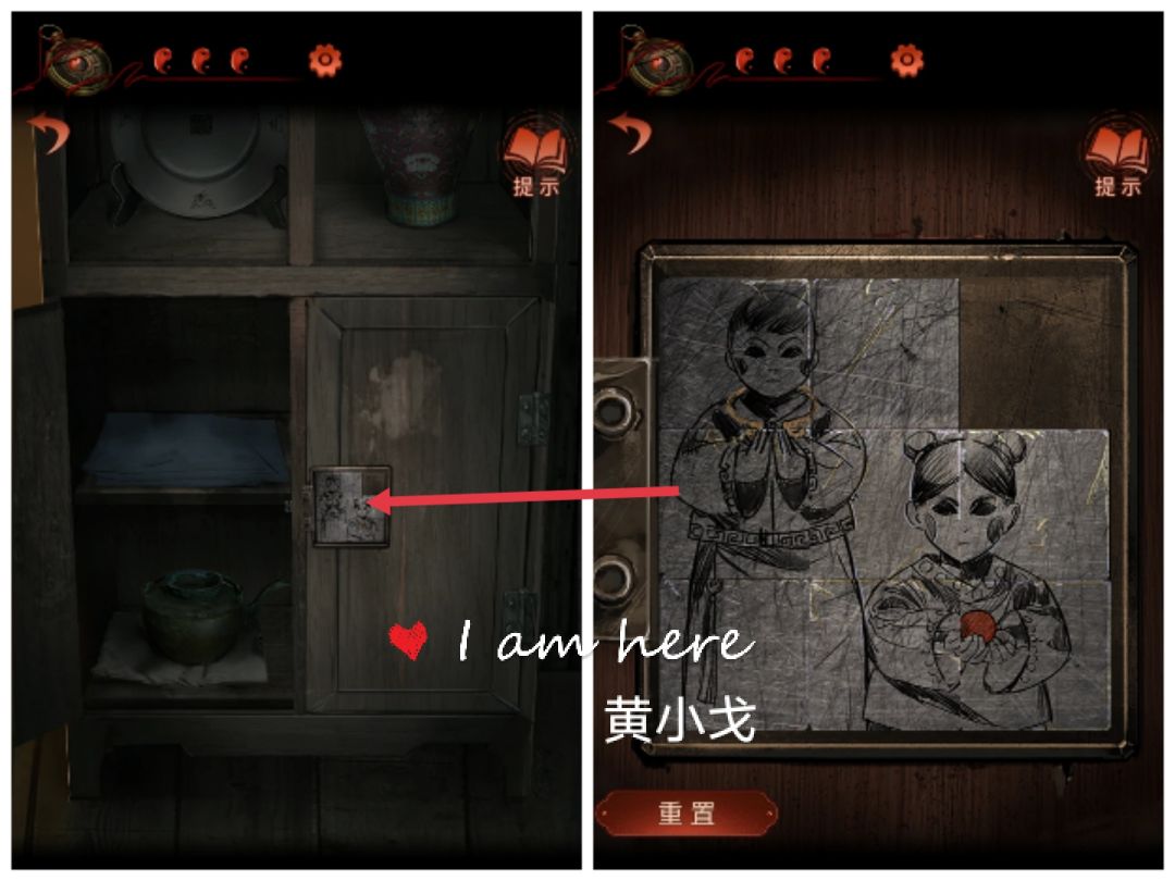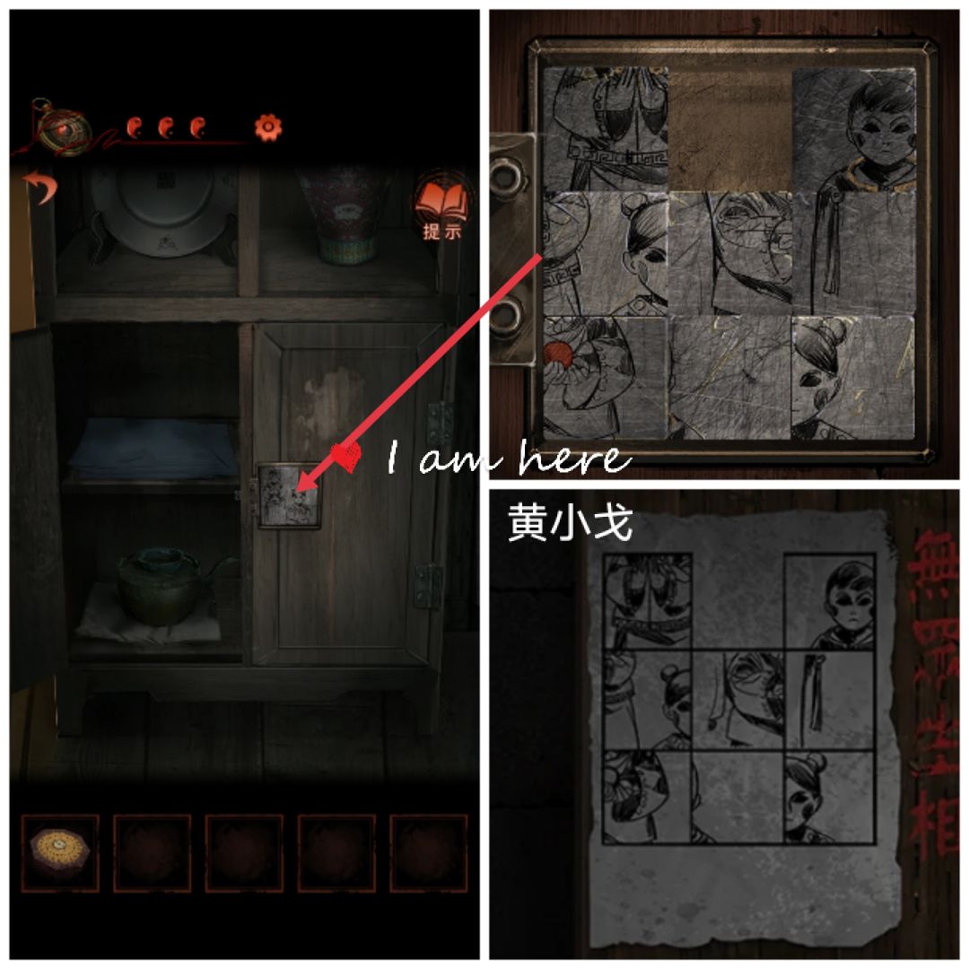 22.(主室)点击左边柜子右侧柜门拼好的图,根据线索把图案调整到正确位置
