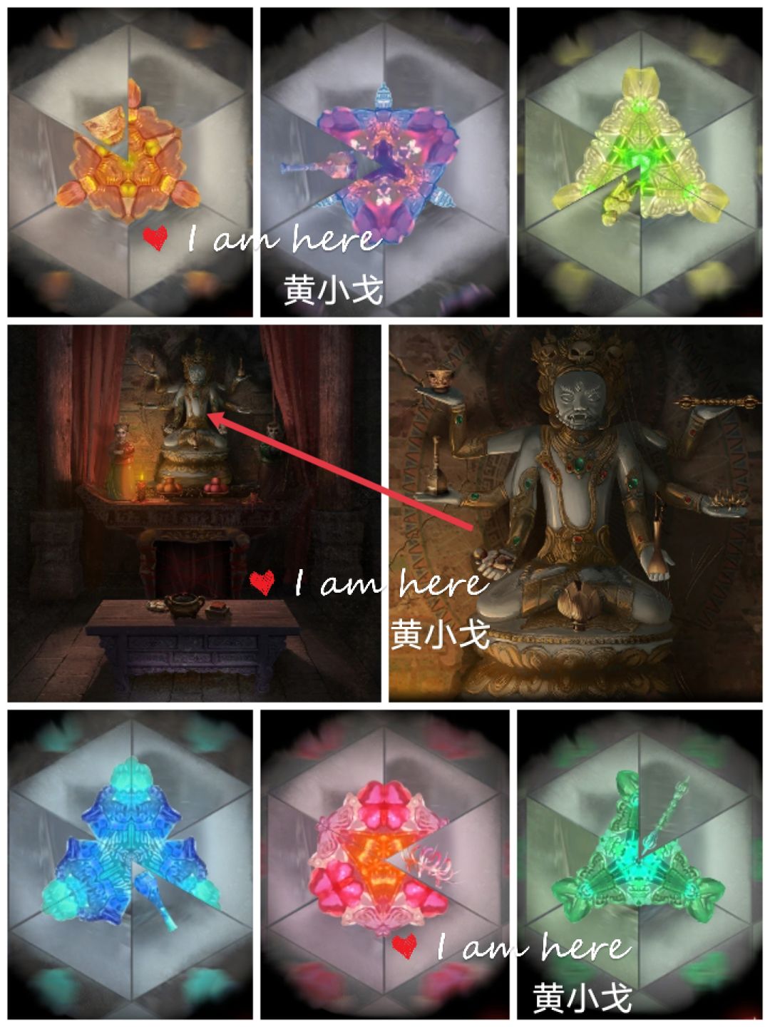 10.(佛堂)点击神像,根据万花筒里的物品位置,摆放佛像手中的饰品至正确位置(碗-左上、铃铛-左中、铜人-左下、右上-尖、右中-花、右下-瓶子)