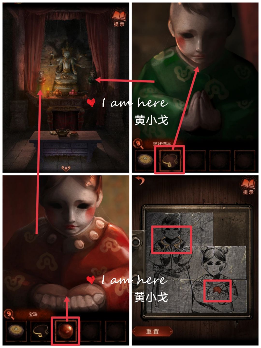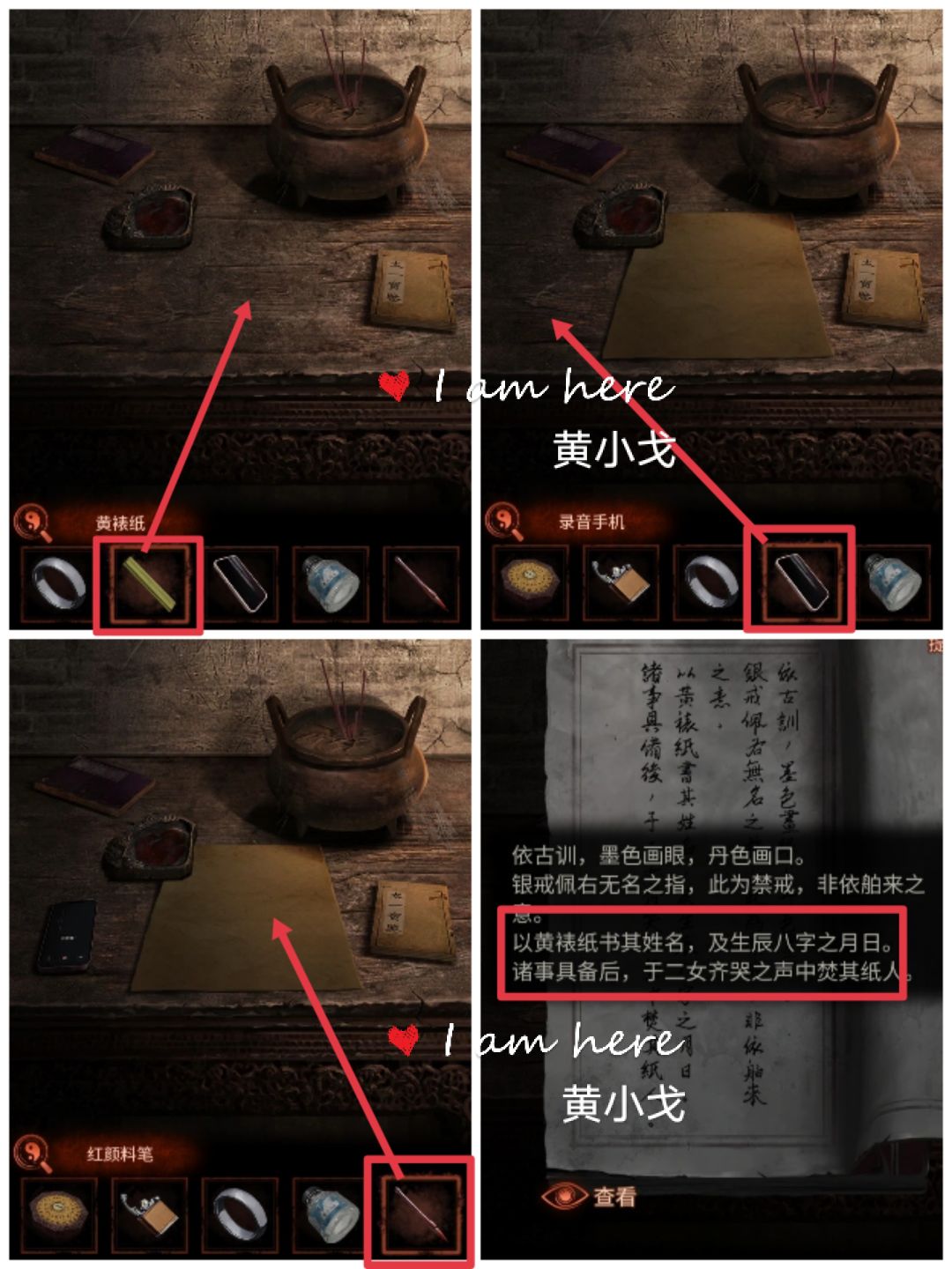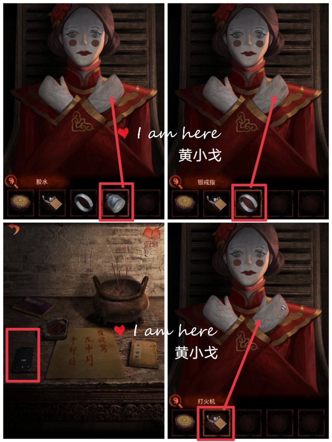 9.用【胶水】涂在纸新娘的右手上,戴上【银戒指】,播放哭声,用【打火机】焚烧纸新娘,触发剧情(此步骤根据红色书本上的线索)