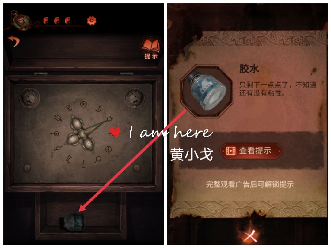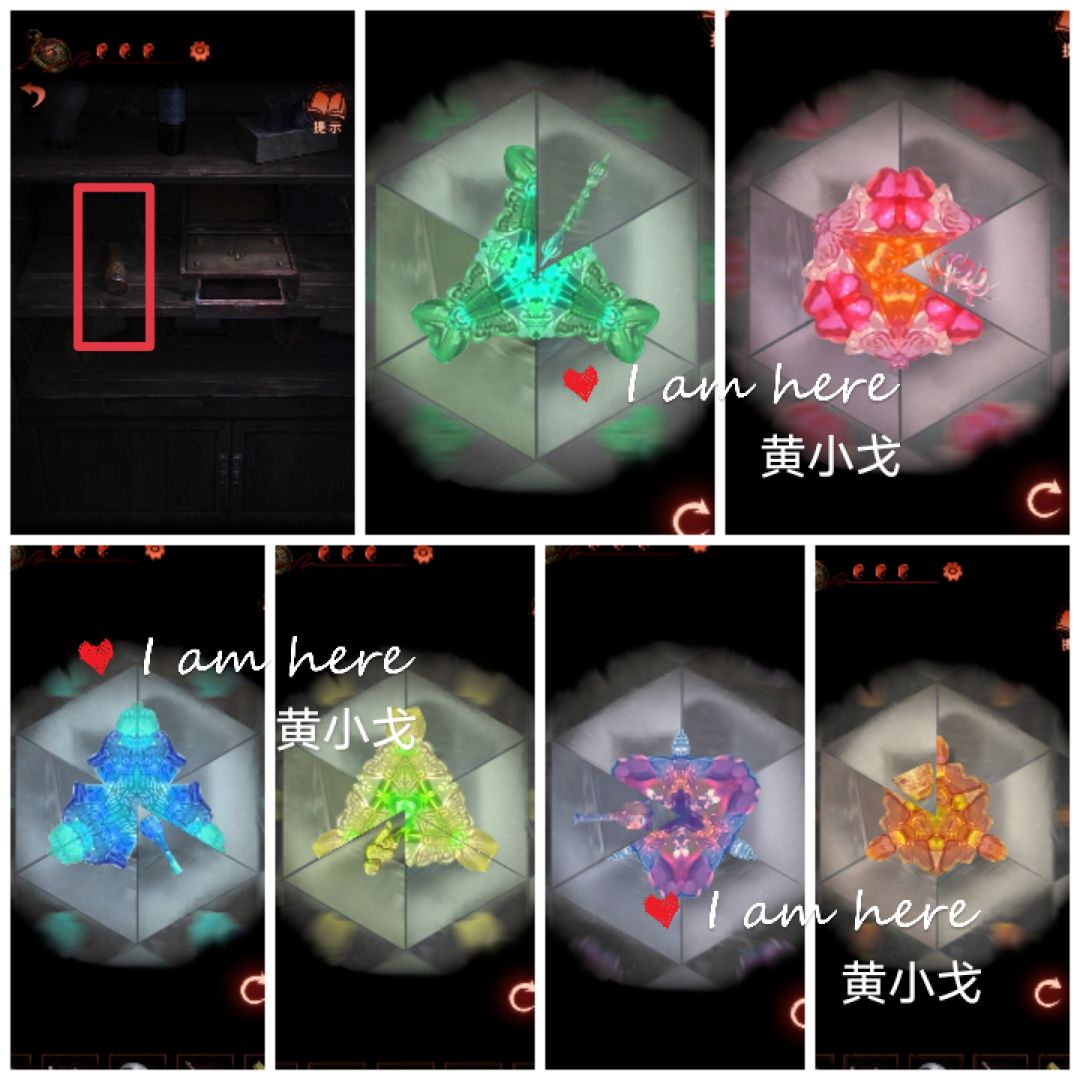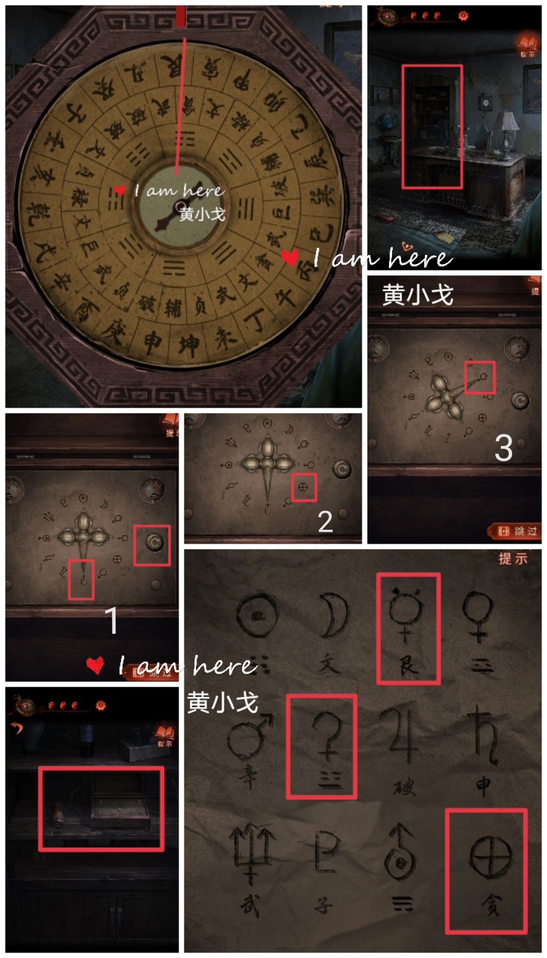 5.点击柜子里的盒子,根据罗盘上的线索(短短长-贪-艮),找到孔明灯上对应的图案,按顺序按住盒子上的顺时针按钮,使指针指向正确的图案
