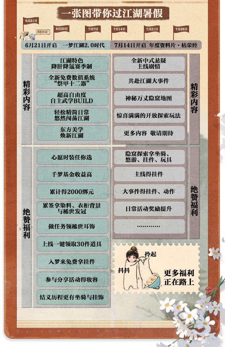 在7月14日年度资料片【枯荣经】中,我们将迎来全新主线、江湖大事件、神秘地图和探索玩法,更多内容,敬请期待!