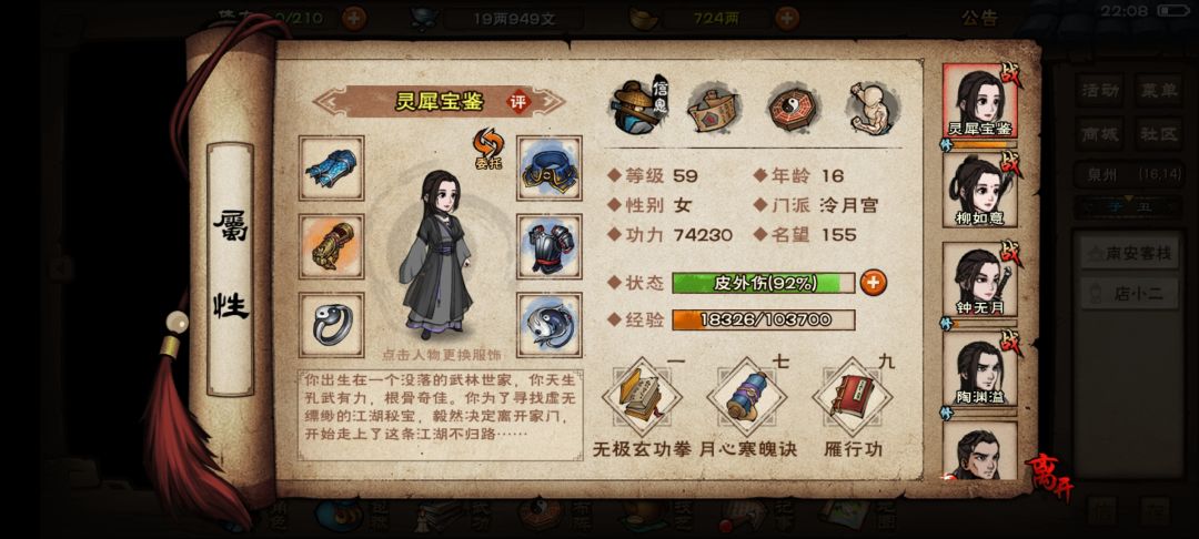 目前进度来说:没有男号快,泠月真是个麻烦的门派,不过等我差不多拿完了秘技,也是要走了,也耽误不了多久。