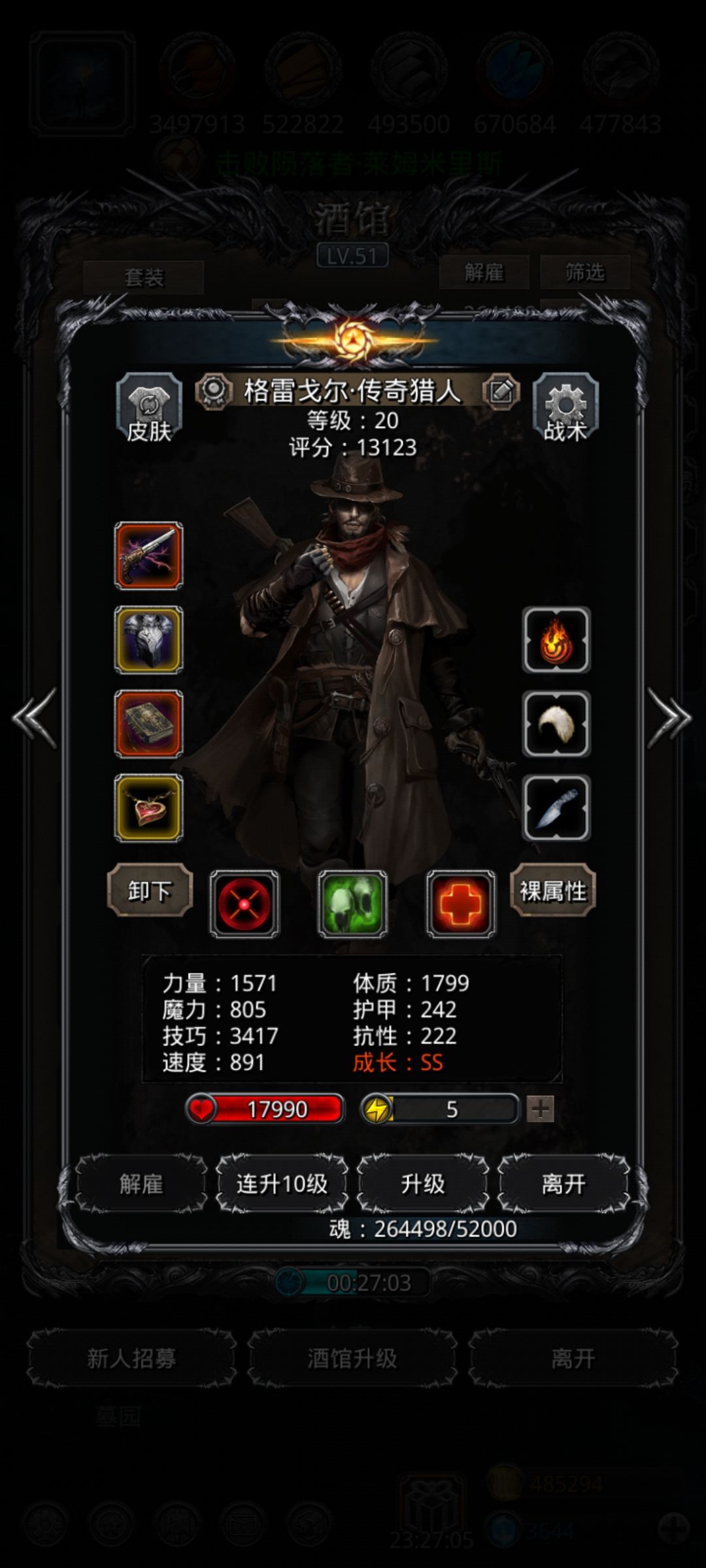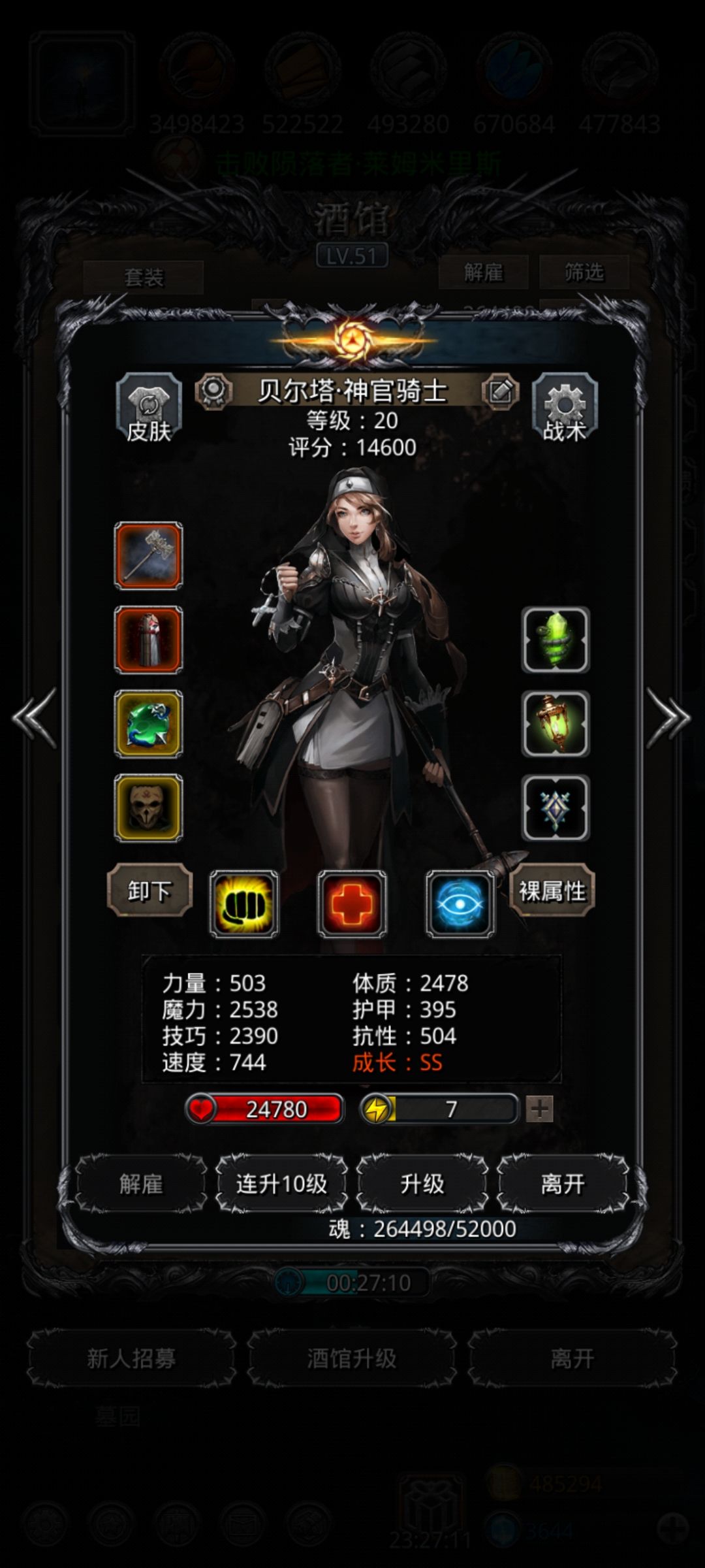 圣龙加技巧,有没有死灵无所谓。剑魔要做到自给自足。关键点来了,神官带绿心,开局奶火法,我这个独裁加的技巧,神官能加800甲,只要老苏第一次攻击时神官触发绿心扛住了就稳过了,然后就是火法神官轮流奶就行了。