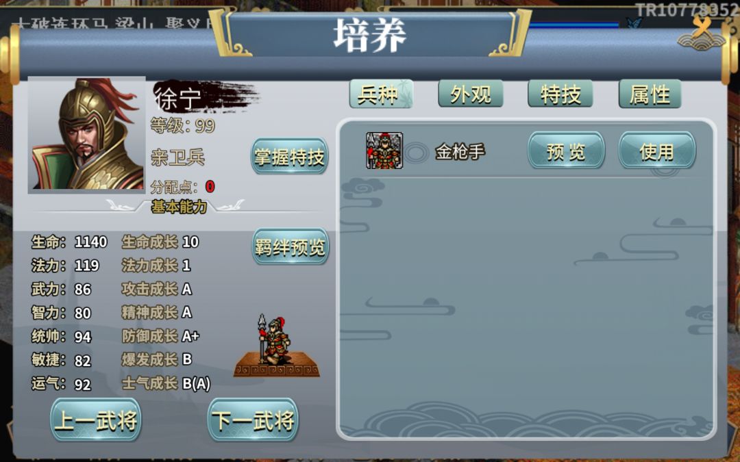 一转道具金枪手,除了多了特技统御-没羽箭范围增加我军防御10%以外,还有就是提升攻击范围及对连环马伤害,就算是这样还是不堪大用。