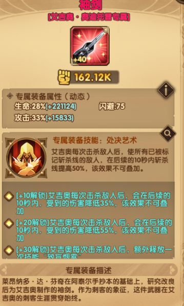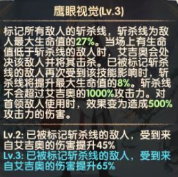 ——斩杀先为敌人最大生命值27%多次释放必杀技会提高斩杀线,每次8%,斩杀线的上限是艾吉奥攻击力的1000%(首领为500%)