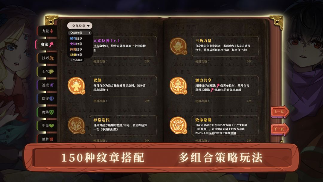 150种属性搭配,多样纹章组合:纹章有稀有、史诗、传说、双重4种品阶,8大类,适用于所有属性。还有打boss随机才能获取的噩梦纹章、及强化才有的双重纹章等。极大扩展游戏的策略玩法。