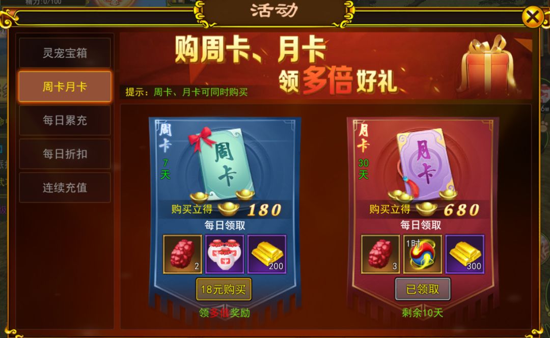 3、最后就是周卡(18)大家根据自己的需求、月卡(68)小氪,氪金玩家必须要买,这两个都是相当于免费赠送的,所以大家一定要买!