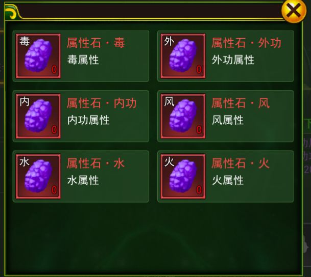 1、“火”属性石:合成到衣服上降低对方攻击力;合成到武器上降低对方防御力。2、“水”属性石:合成到衣服上获得额外愤怒值;合成到武器上可以使对方愤怒值消失。3、“风”属性石:合成到衣服上增加回避;合成到武器上增加命中效果。4、“内功”属性石:合成到衣服上增加武功防御力;合成到武器上增加武功攻击力。5、“外功”属性石:合成到衣服上增加防御力;合成到武器上普通攻击时追加伤害。6、“毒”属性石:合成到衣服上使攻击自己的敌人中毒;合成到武器上增加攻击力。