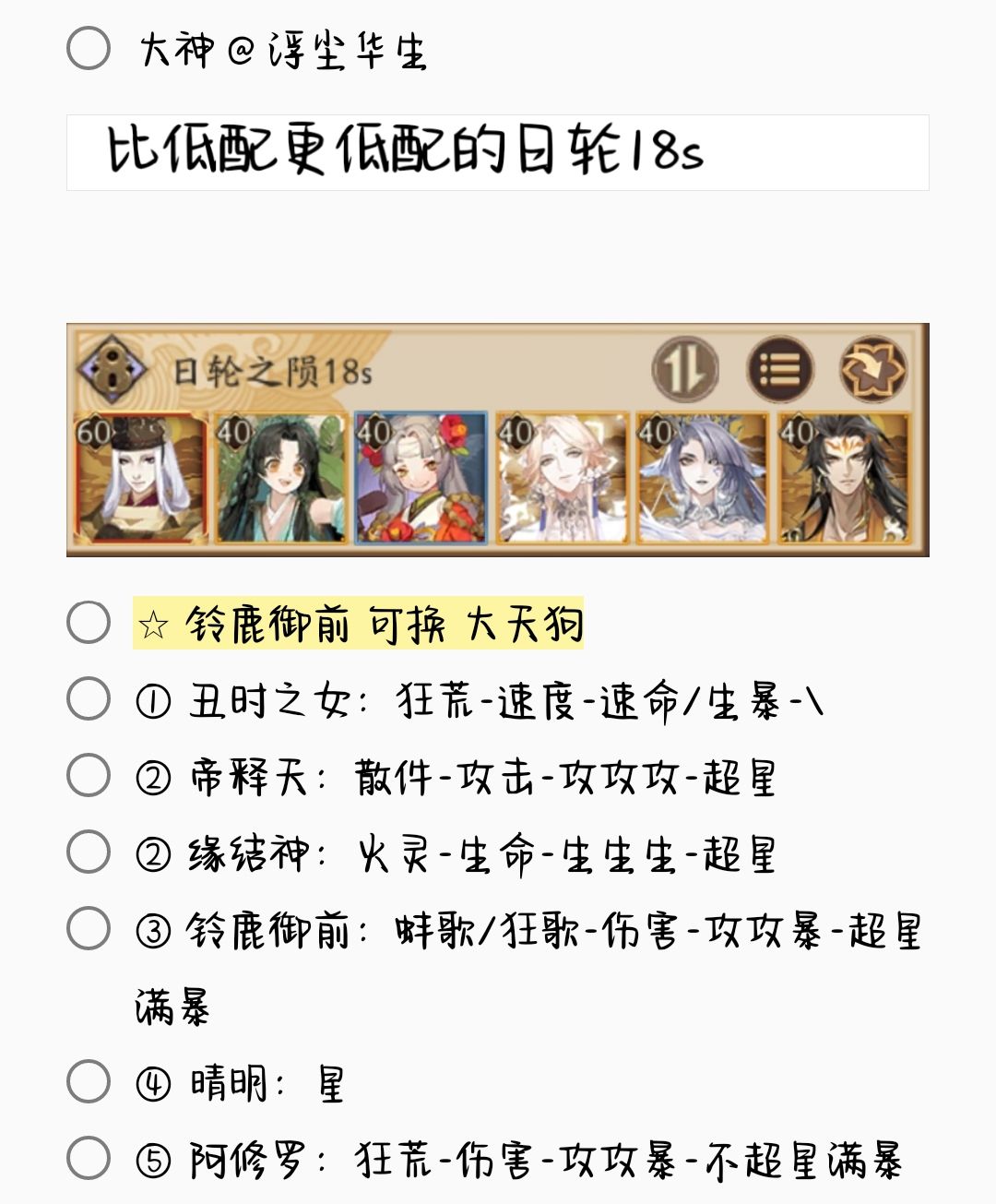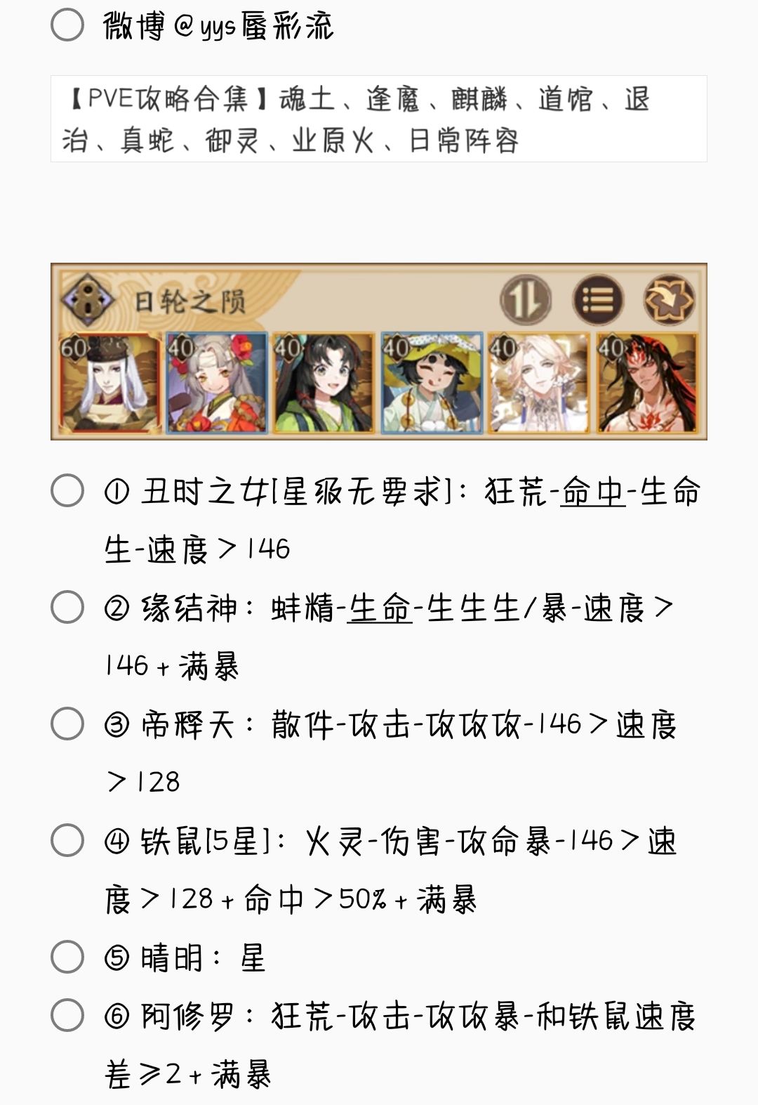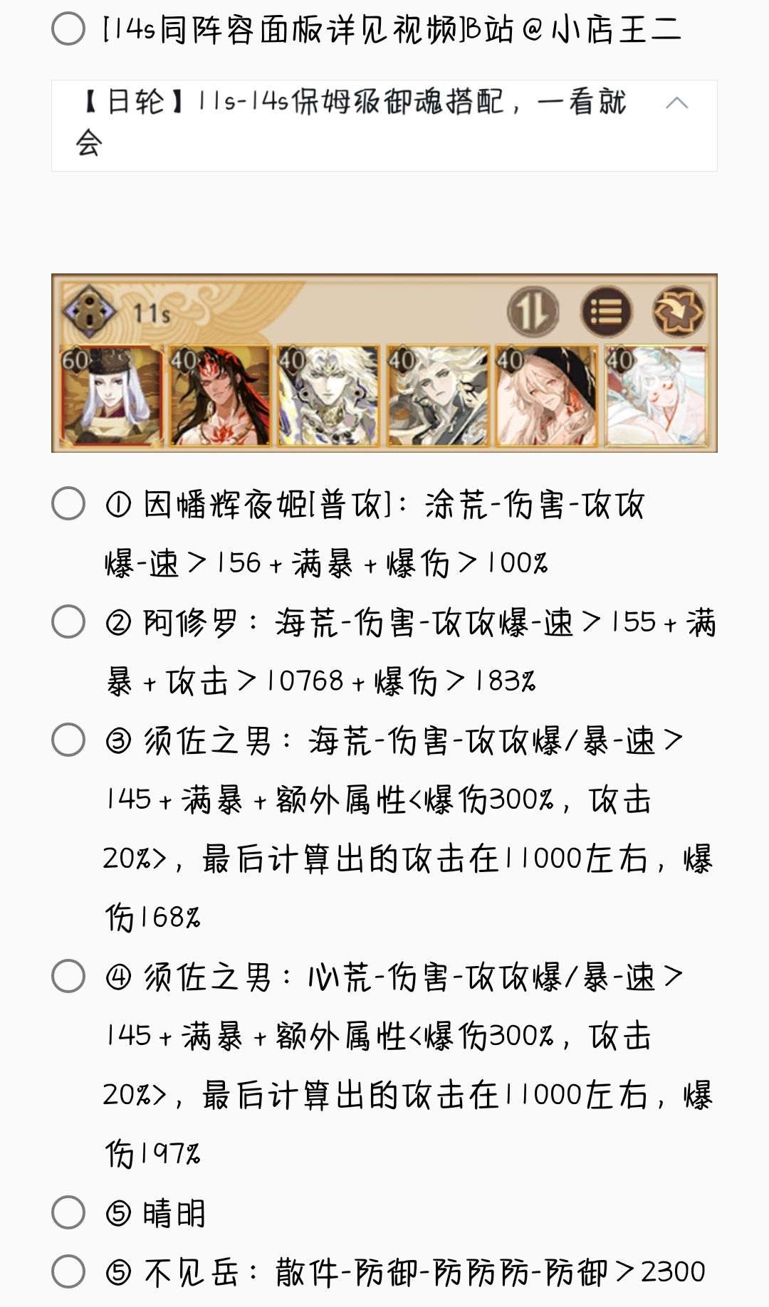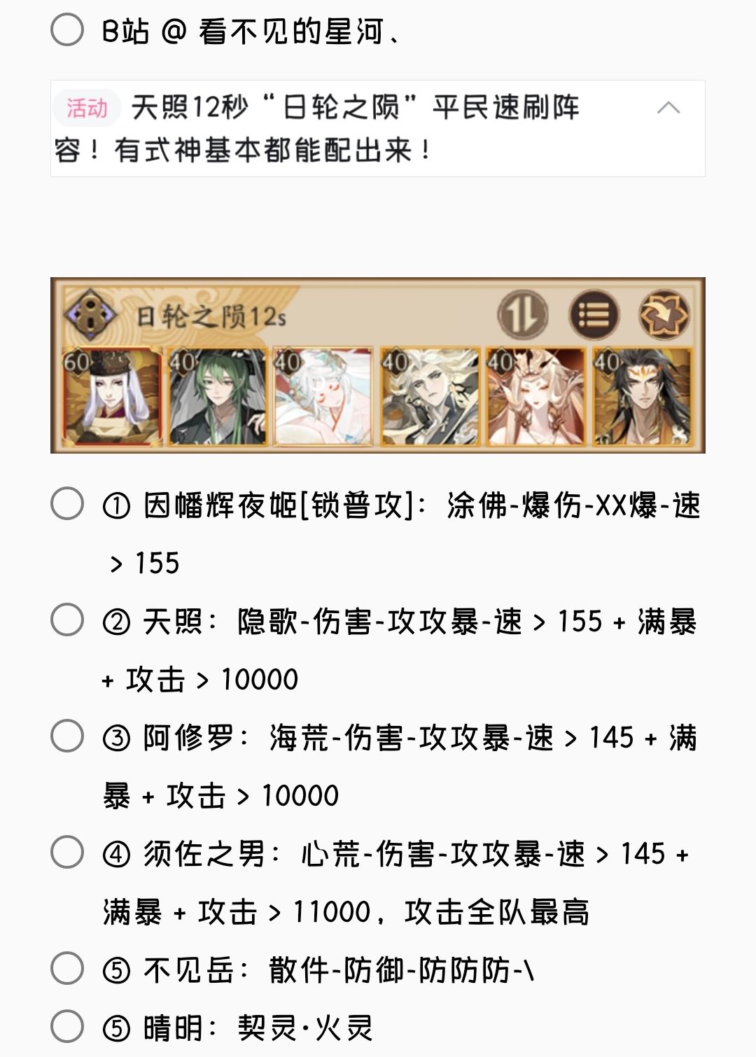 2. 若无特殊文字说明,阵容式神均需六星 + 满技能[151→至少满二技能,以此类推]