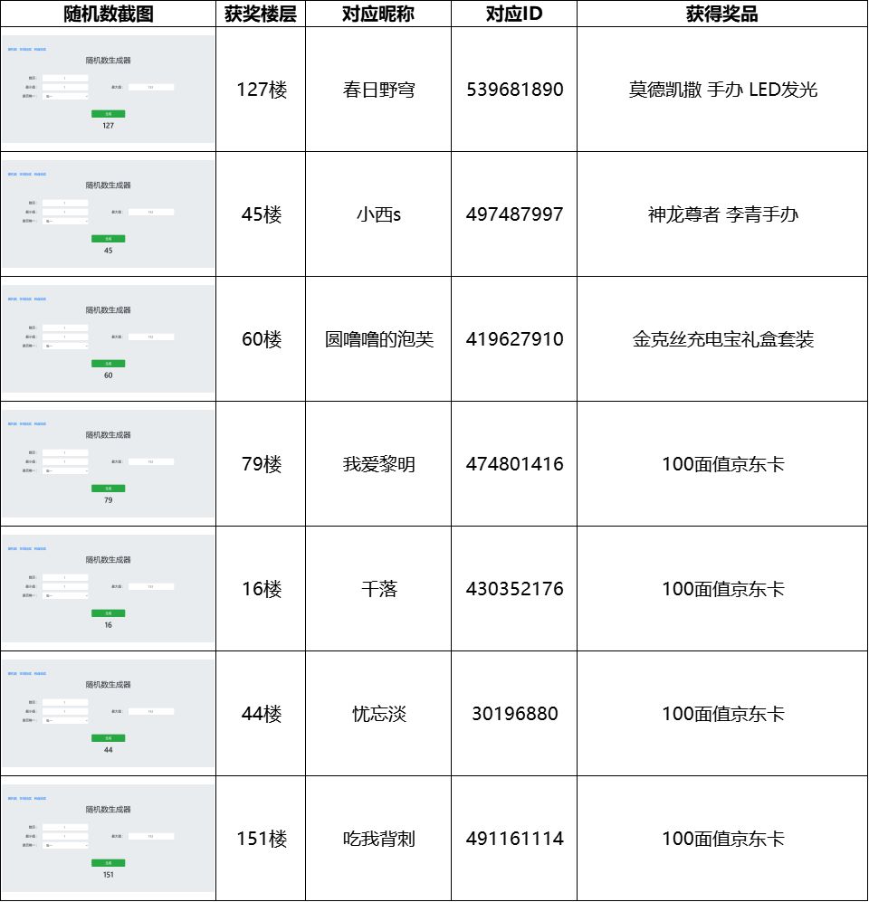 活动截至时有效楼层为135楼,经随机数抽取获取获奖楼层和名单如下: