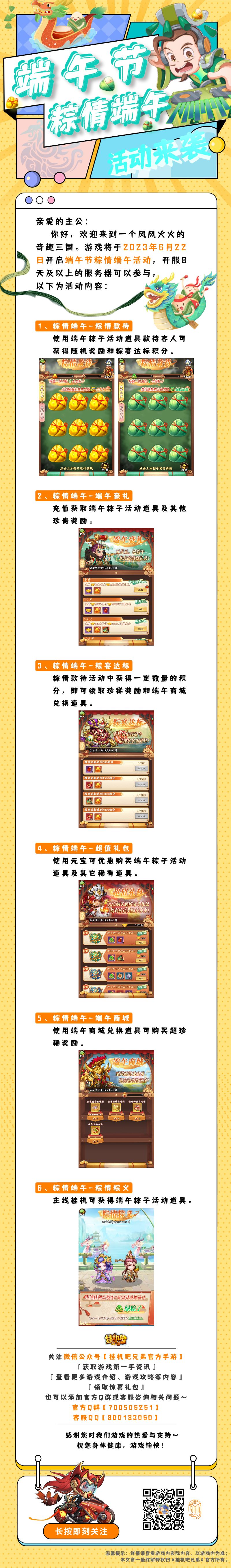 你好,欢迎来到一个风风火火的奇趣三国。游戏将于2023年6月22日开启端午节粽情端午活动,开服8天及以上的服务器可以参与,以下为活动内容: