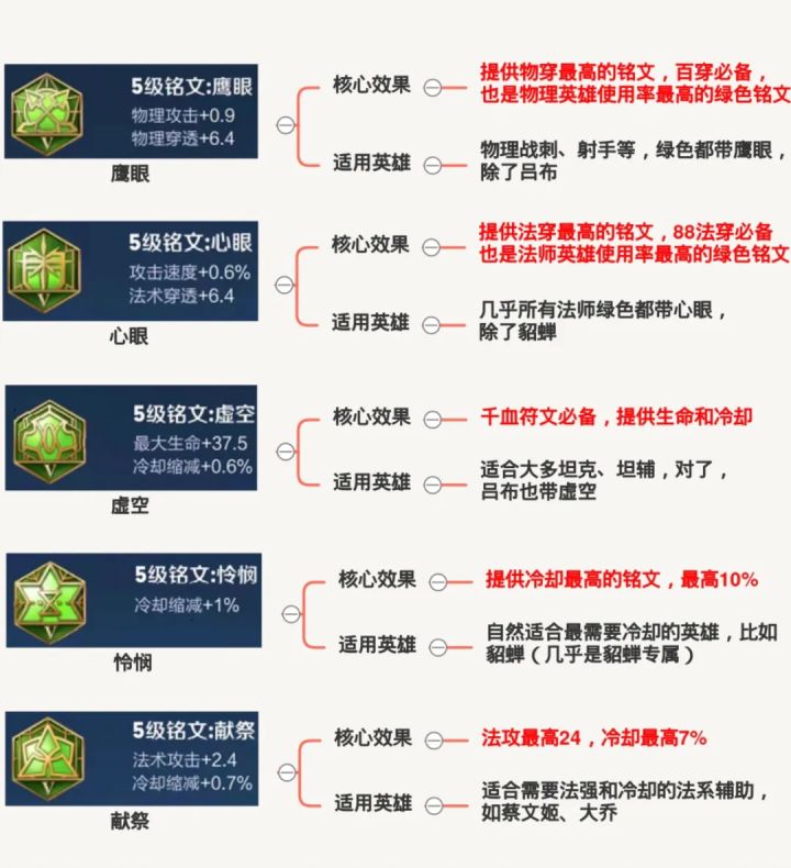每个铭文通过【核心效果】和【适用英雄】来详细解析;