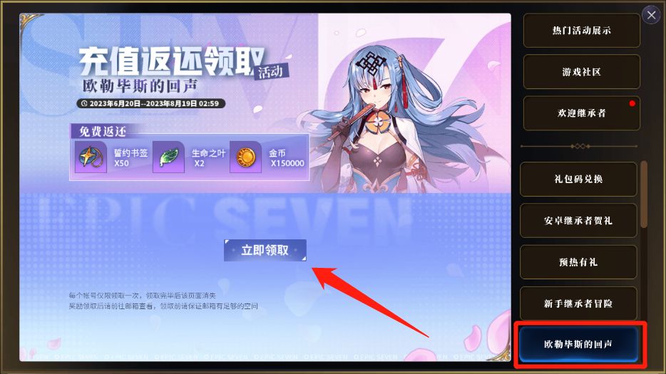 3. 还是该页面,下方”欧勒毕斯的回声”点击后即可领取“冒险的序章”充值返利;