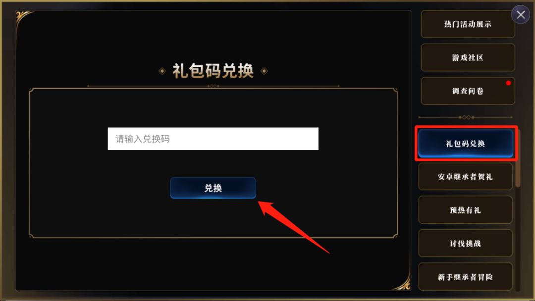 4. 依旧是该页面,点击“礼包码兑换”输入礼包码点击“兑换”按钮即可领取奖励;