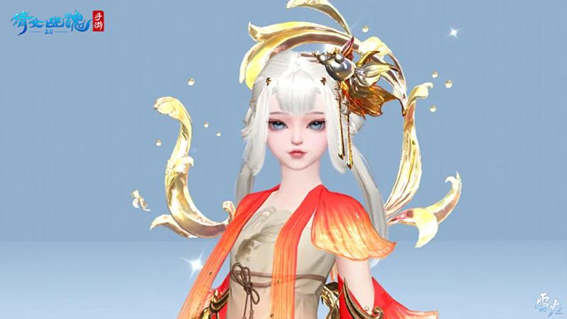 粉金色的眼影为少女温柔的美艳增添粼粼波光,上眼尾处点缀鱼尾似的红妆更是点睛之笔。眉间红痣衬得她气质超然,似妖胜仙。鲤鱼小仙初化人型,对陌生的世界充满好奇,她正眉眼含笑,期待着自己尚未踏足的红尘。