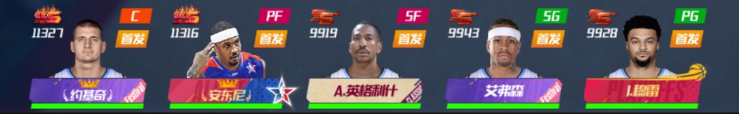 这是一套通过体能压制达到每回合高概率直接得分的阵容,SG位置可以根据实际情况替换为76人哈登或篮网哈登,在比赛前期释放安东尼+约基奇+英格利什的招牌技能实现体能压制(约基奇和英格利什在己方已释放概率得分技能的前提下可触发极强的体能扣除效果),从而快速使球队进入到振奋状态。在安东尼获得第一次球队状态切换的概率加成后释放穆雷招牌技能,此后的每回合中安东尼都将拥有极高的直接得三分概率,从而让球队实现体能和概率得分的双重压制。