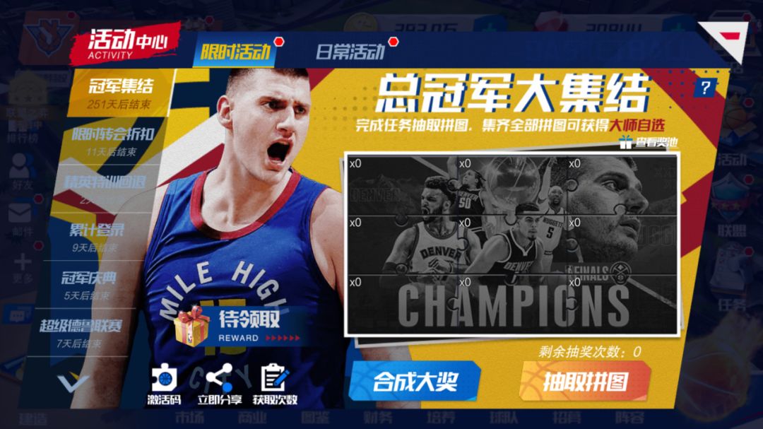 篮球大师的总冠军们速来集结!游戏内完成限时任务即可获得抽奖次数,有机会抽到巨星拼图,凑齐全部巨星拼图后,即可合成大奖,领取SS+球员自选!