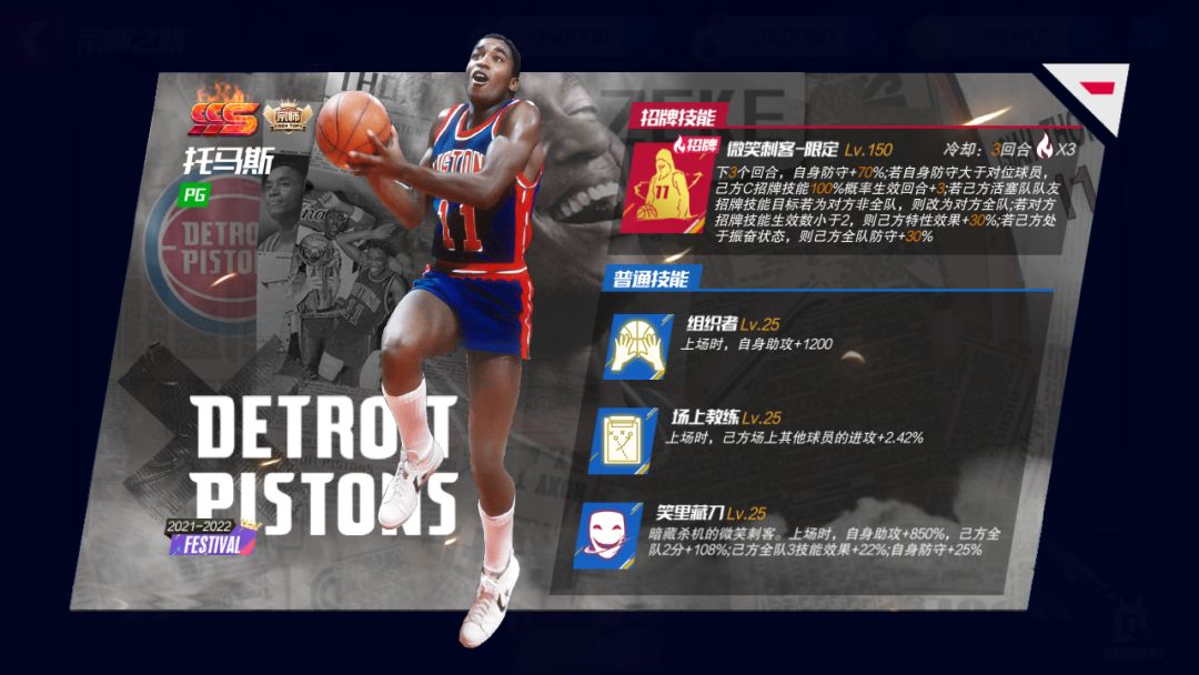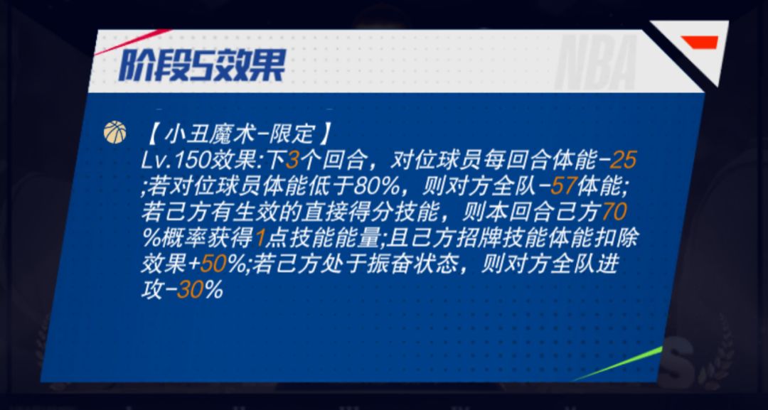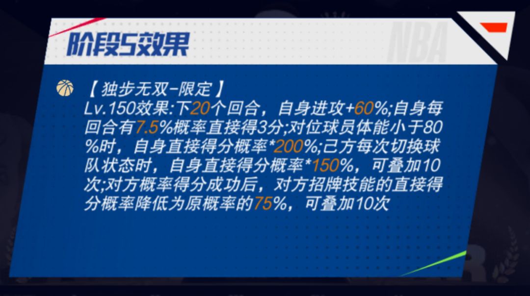 独步无双-限定:下X个回合,自身进攻+X%;自身每回合有X%概率直接得3分;对位球员体能小于X%时,自身直接得分概率*Y%;己方每次切换球队状态时,自身直接得分概率*X%,可叠加Y次;对方概率得分成功后,对方招牌技能的直接得分概率降低为原概率的X%,可叠加Y次(预计在上线同时开启迈向巅峰)