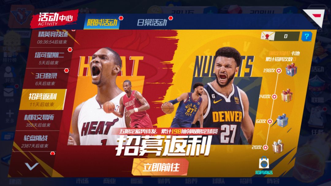 活动期间,将累计经理人在所有使用【巨星招募函】卡池中进行招募的招募次数,招募次数到达一定数量后即可领取进度奖励,奖励中包含巨星介绍信,可用于在招募商店中兑换限定球员。招募至198次,可领取限定球员二选一(限定贾马尔·穆雷、限定克里斯·波什)。