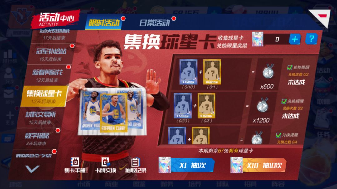 全新的限量球星卡登场!各位经理人可完成本期任务或购买限量卡包抽取球星卡。也可和其他玩家交换收集到的球星卡。最终,根据激活球星卡图鉴个数获得对应奖励,同时可在活动内使用收集到的球星卡兑换相应的奖励。