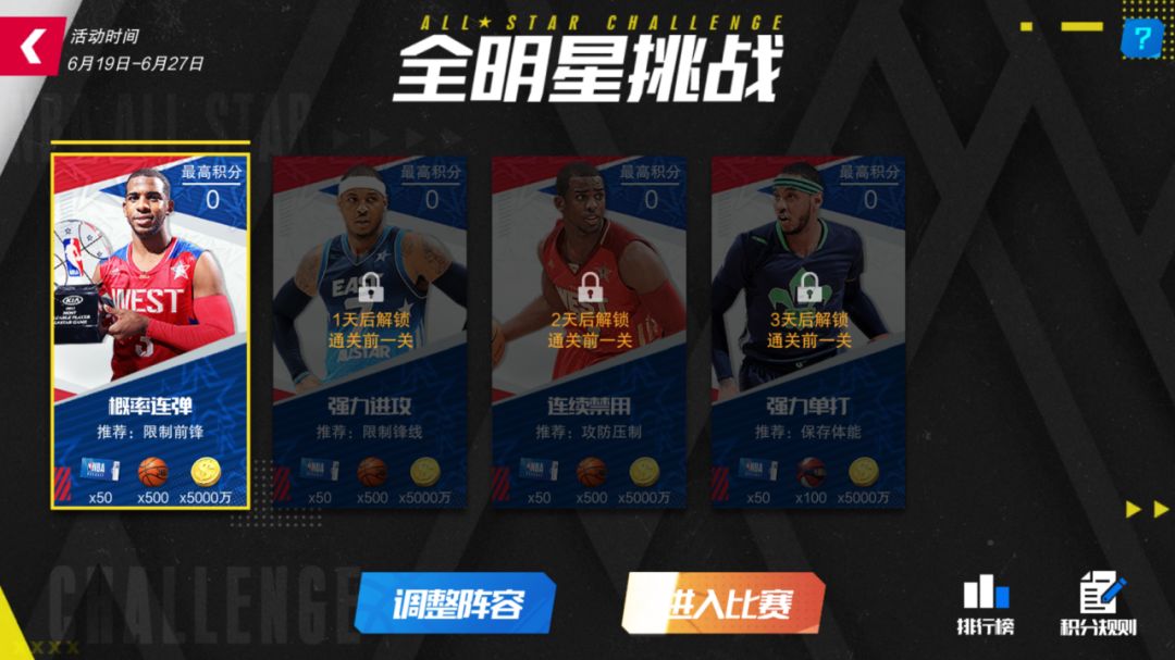多轮全明星挑战赛,每天开放一轮,只有成功挑战前一轮后才可以进入下一轮,挑战成功丰厚奖励!