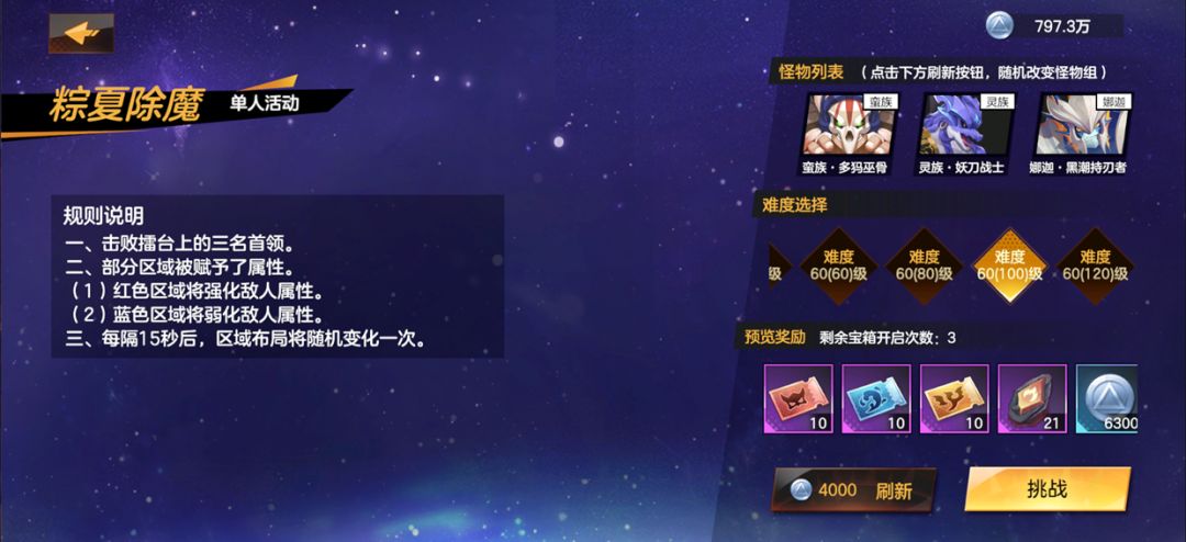 玩家可在活动关卡入口界面,消耗银币刷新将要挑战的敌人,每次挑战将同时面对三名首领类型的敌人。