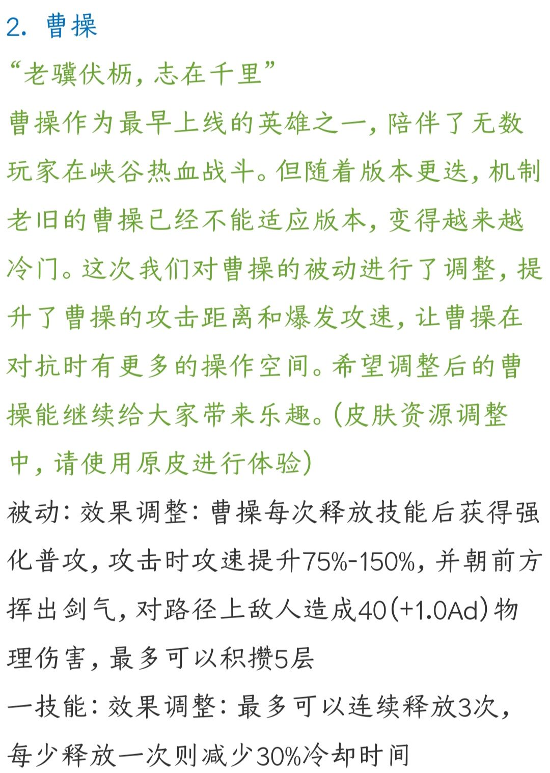 曹操的痛点:被动攻速鸡肋又容易断(尤其是不详改版+攻速阈取消后);普攻距离短+1技能位移距离短(导致了又难摸人又难A中)。而且抛开吸血 回复只能靠大招 贼容易被拿捏 机制太落后了。