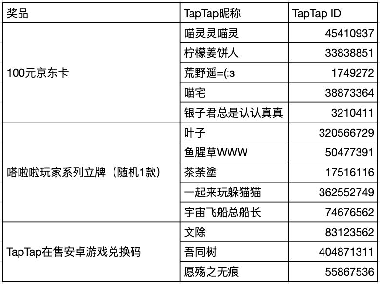 领奖方式:请加入QQ群324137870,将TapTap个人ID页截图私信发送给群主嗒啦啦领取奖品。