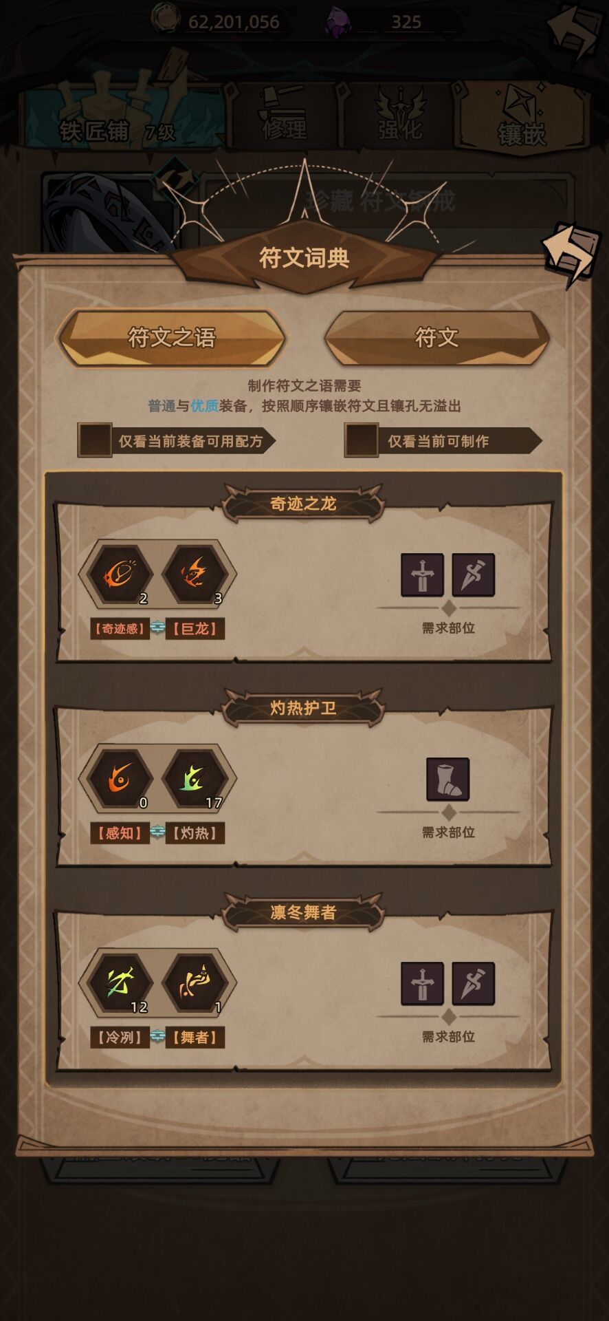 点击符文词典,之后会跳出所有符文之语装备的符文之语属性以及所需要镶嵌的符文和顺序。可以选择仅看当前装备配方或者仅看当前可制作两个选项来筛选出你所需要的符文之语装备。