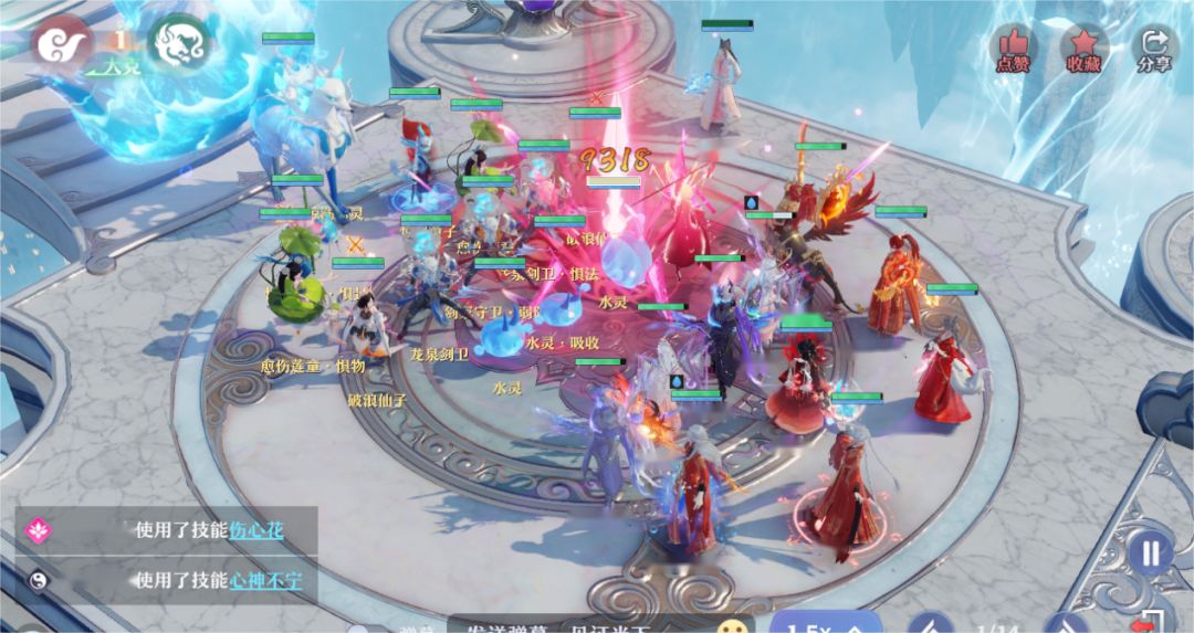 第1回合,封龙子和剑卫,奶辅喝酒。物理跟两只灵兽直接集火弱防,将其击倒。然后分配好灵兽伤害清掉3只水灵,后续每回合都是同样的操作。比如3只念奴娇各负责一只,2只人马或幽冥卫跟集火。