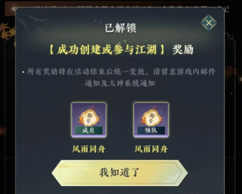1、创建/加入江湖将解锁【称号:风雨同舟】奖励