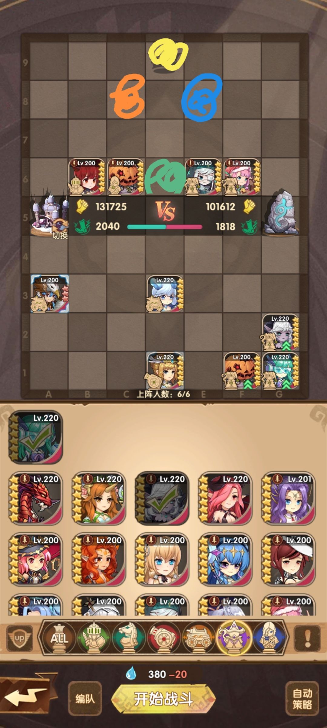 这部分由于系统bug了没留下来录像,这里摆了阵容讲一下思路,等后面有机会了再打过来放录像