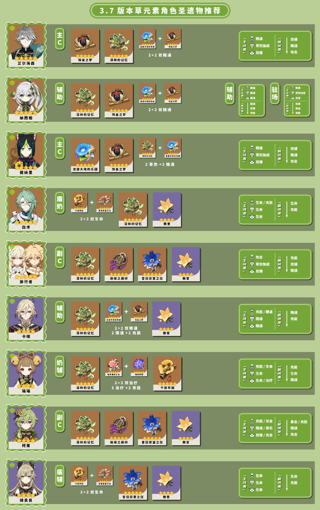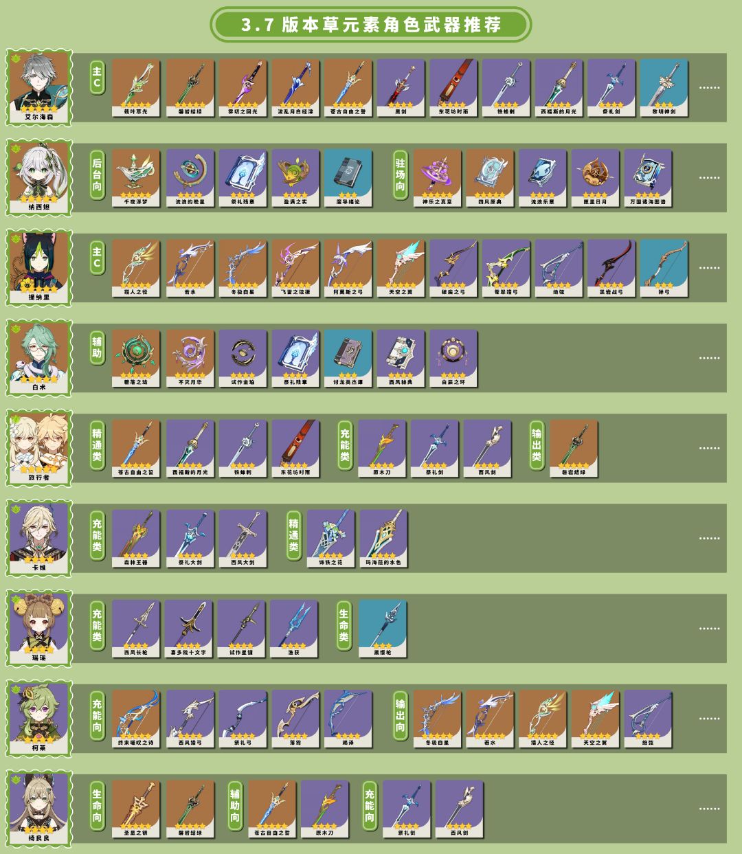 草元素是须弥版本的重心,这些草元素角色的搭配也是很多小伙伴关心的重点,这一期给大家带来的是截至3.7版本所有草元素角色的武器&圣遗物推荐和需求分析,希望对大家有所帮助。