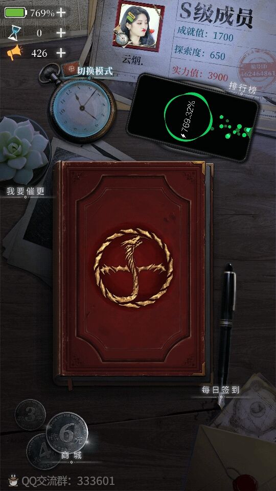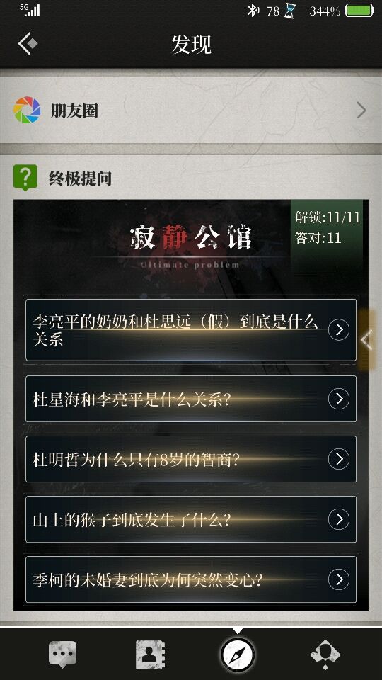 3、关于终极提问 终极提问不要急着做(虽然可以多次进入)!回答问题之前一定先想清楚你的答案是否足够深层次以及问题人物的相关事件!不然很有可能你一打开就傻眼了(因为我就是)!还有,终极提问开始答题要花30电,而且里面每道题半分钟时间,如果你没过,这30电就喂了狗了(并不),但如果你过了,不仅把30电返还给你(相当于没扣电),还有50成就值,并且还有文字助你理解故事情节。