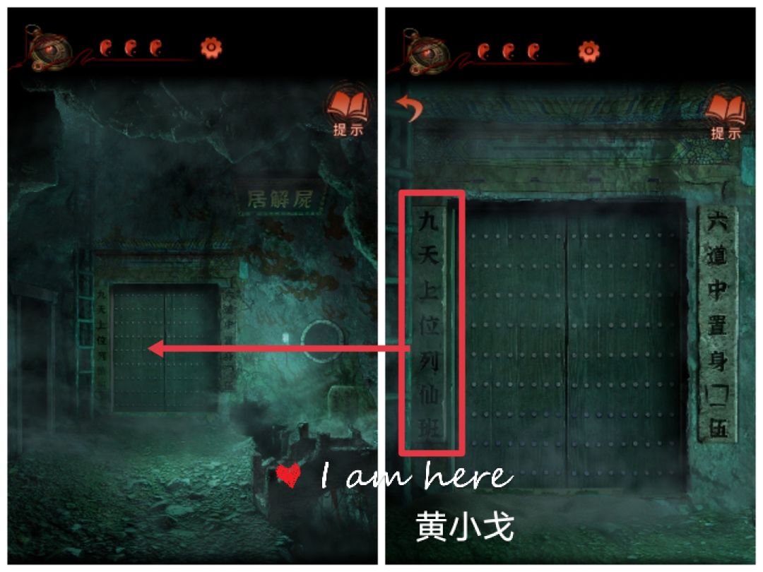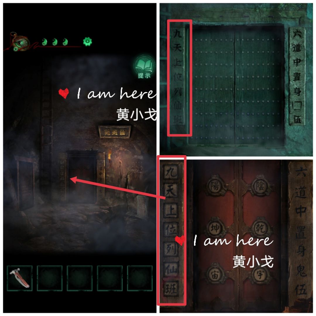 11.点击门,根据石碑上的线索和机巧阁机关上的线索,调整门上的按钮(左乾宙坤,右神凡鬼),打开暗门(1.天道左旋,以鬼为始:说明从鬼开始,顺序由左向右,即鬼凡神坤宙乾