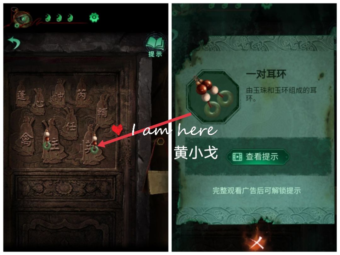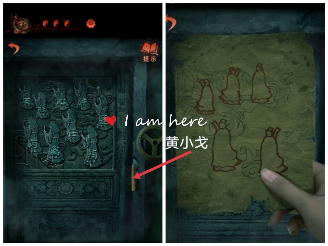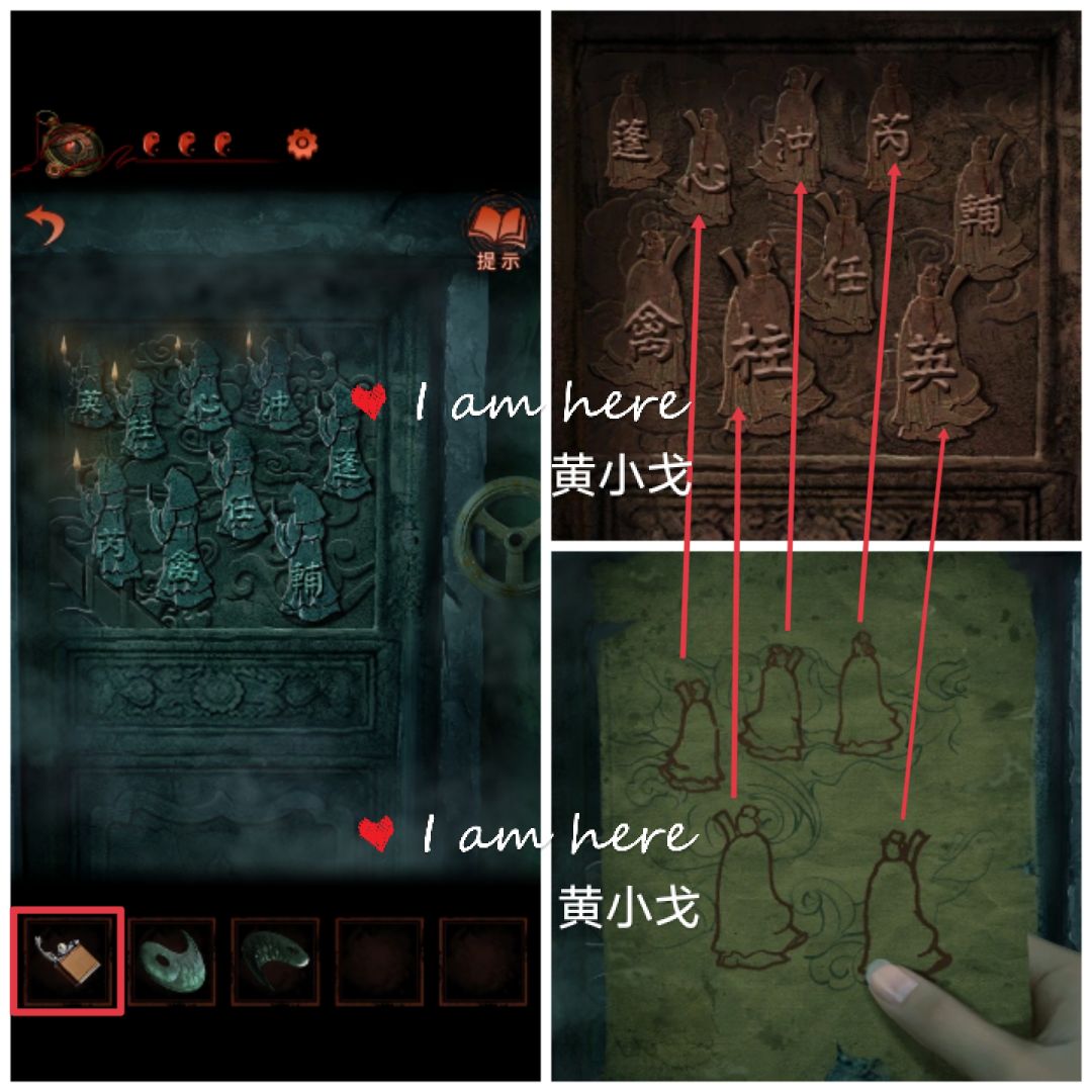 15.根据【黄纸】上的线索和男主视角暗门上的浮雕线索(根据女主视角中【黄纸】,找到暗门上浮雕中对应人和字:心沖芮柱英),用打火机点燃(心沖芮柱英)浮雕